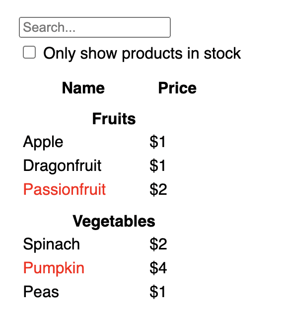 function ProductCategoryRow({ category }) { return ( <tr> <th colSpan="2"> {category} </th> </tr> ); } function ProductRow({ product }) { const name = product.stocked ? product.name : <span style={{ color: 'red' }}> {product.name} </span>; return ( <tr> <td>{name}</td> <td>{product.price}</td> </tr> ); } function ProductTable({ products }) { const rows = []; let lastCategory = null; products.forEach((product) => { if (product.category !== lastCategory) { rows.push( <ProductCategoryRow category={product.category} key={product.category} /> ); } rows.push( <ProductRow product={product} key={product.name} /> ); lastCategory = product.category; }); return ( <table> <thead> <tr> <th>Nombre</th> <th>Precio</th> </tr> </thead> <tbody>{rows}</tbody> </table> ); } function SearchBar() { return ( <form> <input type="text" placeholder="Buscar..." /> <label> <input type="checkbox" /> {' '} Mostrar solo productos en stock </label> </form> ); } function FilterableProductTable({ products }) { return ( <div> <SearchBar /> <ProductTable products={products} /> </div> ); } const PRODUCTS = [ {category: "Frutas", price: "$1", stocked: true, name: "Manzana"}, {category: "Frutas", price: "$1", stocked: true, name: "Fruta del dragón"}, {category: "Frutas", price: "$2", stocked: false, name: "Maracuyá"}, {category: "Verduras", price: "$2", stocked: true, name: "Espinaca"}, {category: "Verduras", price: "$4", stocked: false, name: "Calabaza"}, {category: "Verduras", price: "$1", stocked: true, name: "Guisantes"} ]; export default function App() { return <FilterableProductTable products={PRODUCTS} />; }